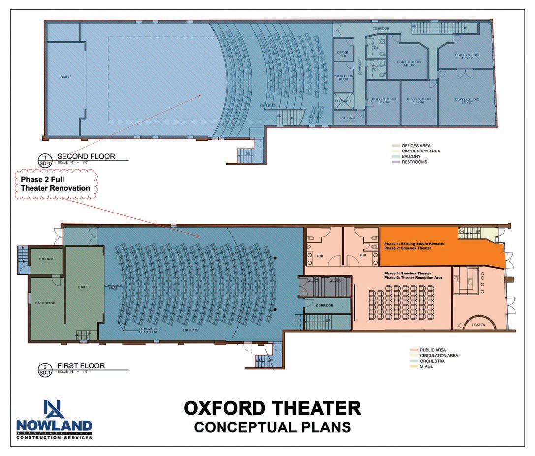 Nowland Associates, Inc., the design build firm based out of Newark, Del., who completed the recent expansion of the Oxford Library in 2015, recently provided some initial in-kind concept plans for the project as well as preliminary renovation budgets. These draft plans were revised slightly from original concepts developed by Kennett Square-based architect Dennis Melton during the first revitalization attempt. Melton was an original member of the early theater initiative and has been re-engaged as an enthusiastic supporter of the project, along with Andrew Atkinson, a past borough council member.