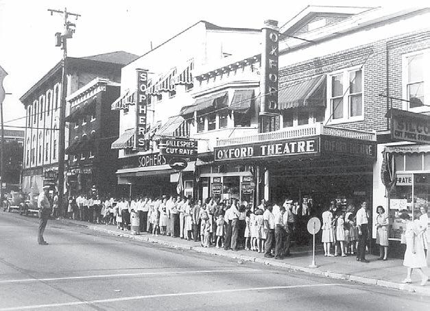 A historic photo showing the popularity of the Oxford Theater, circa the 1940s. The marquee and exterior remain largely unchanged today.