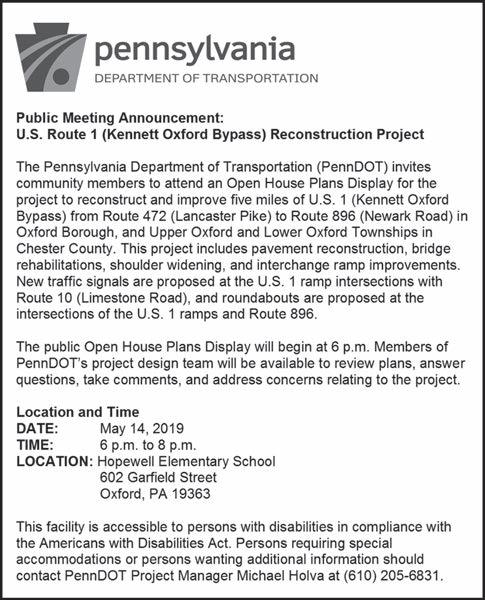 ING DRIVE TOWNSHIP OF PENN, CHESTER COUNTY, PA. PROPOSALS will be received online via the PennBID Program by the Board of Supervisors, Penn Township, Chester County, Pennsylvania until 2:00 P.M., Prevailing Time, on Thursday May 30, 2019 for the following: The bid consists of the replacement of 25 L.F. of HDPE Smoothwall Culvert Pipe with 25 L.F. 30” x 19” Reinforced Concrete Pipe crossing Baker Road approximately 1,100 feet west of Jennersville Road (S.R. 0796) and the Repair of 65 L.F. of existing CMP pipe crossing Ewing Drive approximately 350 feet north of Woodview Road using Cast in Place Pipe no-dig technology. All Bids will be publicly opened and read aloud by the Township at 2:15 P.M. Prevailing Time, on Thursday, May 30, 2019 at the Penn Township Building, 260 Lewis Road, West Grove, PA 19390. Copies of the Form of Proposal and Specifications are available at no cost at www.PennBID.net beginning Monday 6, 2019. Each Bidder must deposit with his/her bid, security in the form of a bid bond or certified check in the amount of not less than ten percent (10%) of the total bid made payable to the order of the Penn Township. Each bid must be accompanied by a signed commitment of the proposed surety offering to execute a Performance Bond, as well as the Letter of Intent, and Non-Collusion Affidavit. All Bidders must be prequalified by the Pennsylvania Department of Transportation. All Forms and Papers required to accompany the bid must be up-loaded to PennBID prior to the date and time bids are to be received. The successful Bidder will be required to furnish a Contractor’s Performance Bond and a Labor and Materialmen’s Bond in an amount of the accepted bid. The Surety Company and form of surety shall be subject to the approval of Penn Township. The Bond Company should have no less than an “A” rating (Best Rating) and provide documentation of their authority to do business in the Commonwealth of Pennsylvania. In addition, the Bond should be provided without a reinsurer. No bidder may withdraw his/her bid within sixty (60) days after the date set for the receiving and opening of bids. Pennsylvania prevailing wage rates will apply to this project, in addition to any and all other applicable federal, state, and local laws, statutes, ordinances, rules and regulations. Penn Township reserves the right to reject any or all proposals or parts thereof for any cause whatsoever. By Order of the Penn Township Board of Supervisors, Karen Versuk, MBA, PhD Director of Operations 5p8-1t FORM OF ADVERTISEMENT FOR THE RESURFACING AND STREET IMPROVEMENTS FOR THE YEAR 2019 FOR PENN TOWNSHIP, CHESTER COUNTY, PA PROPOSALS will be received online via the PennBID Program by the Board of Supervisors, Penn Township, Chester County, Pennsylvania until 2:00 P.M., Prevailing Time, on Thursday May 30, 2019 for the following: The bid consists of Reconstructing State Road from Hipkins Road to Kelton Road including 50 LF of Kelton Road for an approximate area of 1,000 LF x 24’wide and Shoulder Widening at the Intersection of State Road and Kelton Road. The Bid also includes Surface Treatment ( 2 Layers of Oil and Chip) including a Fog Seal on Baker Road from N. Jennersville Road to the Municipal Boundary for an approximate length of 5,450 LF @ 18’ wide, including 400 LF of Shoulder Widening at various locations and Ewing Drive from W. Woodview Road to Cul-de-Sac an approximate length of 765 LF @ 22.5’ wide and the 110’ diameter cul-de-sac. All Bids will be publicly opened and read aloud by the Township at 2:15 P.M. Prevailing Time, on Thursday, May 30, 2019 at the Penn Township Building, 260 Lewis Road, West Grove, PA 19390. Copies of the Form of Proposal and Specifications are available at no cost at www.PennBID.net beginning Monday 6, 2019. Each Bidder must deposit with his/her bid, security in the form of a bid bond or certified check in the amount of not less than ten percent (10%) of the total bid made payable to the order of the Penn Township. Each bid must be accompanied by a signed commitment of the proposed surety offering to execute