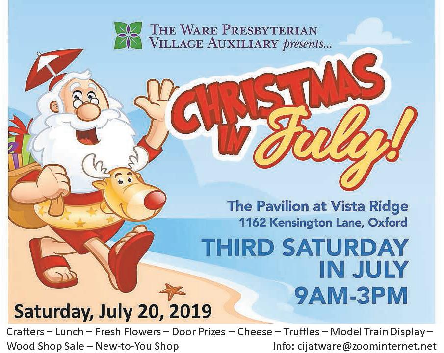 The 3rd Annual Christmas in July & Craft Fair will be held on July 20 from 9 a.m. to 3 p.m. in the Pavilion at Vista Ridge at Ware Presbyterian Village (1162 Kensington Lane, Oxford). Artisans will be selling jewelry, quilted and embroidered items, handpainted cards, stained and fused glass, handbags, paintings, scarves, wreaths, painted porcelain, felted animals and bird houses, wood products, books, puzzles, flowers and more. A food court will offer local cheeses, honey, jams, wines, truffles and more. A handmade quilt will be sold by silent auction. The Ware model railroad will be on display at the Ware Mansion. Parking is free. Transportation is available on campus via a shuttle bus. Box lunches and beverages will be available for purchase. For more information, email cijatware@zoominternet.