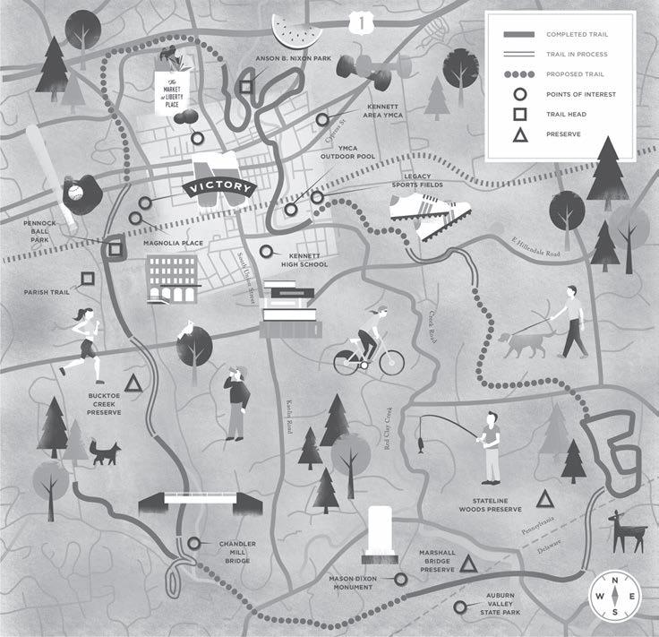 The Kennett Greenway currently has 6.5 miles of existing trails and an additional 1.8 miles that are in the planning stages or are about to be developed. Beginning clockwise at its northernmost point, the completed trail will begin just south of Route 1, travel past the KAU Little League fields and through Anson B. Nixon Park, extend through the east side of the borough and then veer south of the Legacy sports fields. It will then extend slightly southeast across East Hillendale Road and to the Stateline Woods Preserve, and slightly over the state line into Delaware, where it will intersect the Marshall Bridge Preserve and Auburn Valley State Park in Yorklyn. From there, the trail will reach its southernmost point near the MasonDixon monument, and veer north through the Chandler Mill Nature Preserve, the Bucktoe Creek Preserve, the Parish Trail and past Pennock Park, where it will travel through the western end of the borough to just south of Route 1. Penn Trails, LLC project manager Amy Lutsko introduced the master plan of the project that will