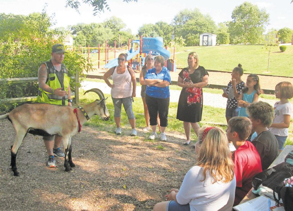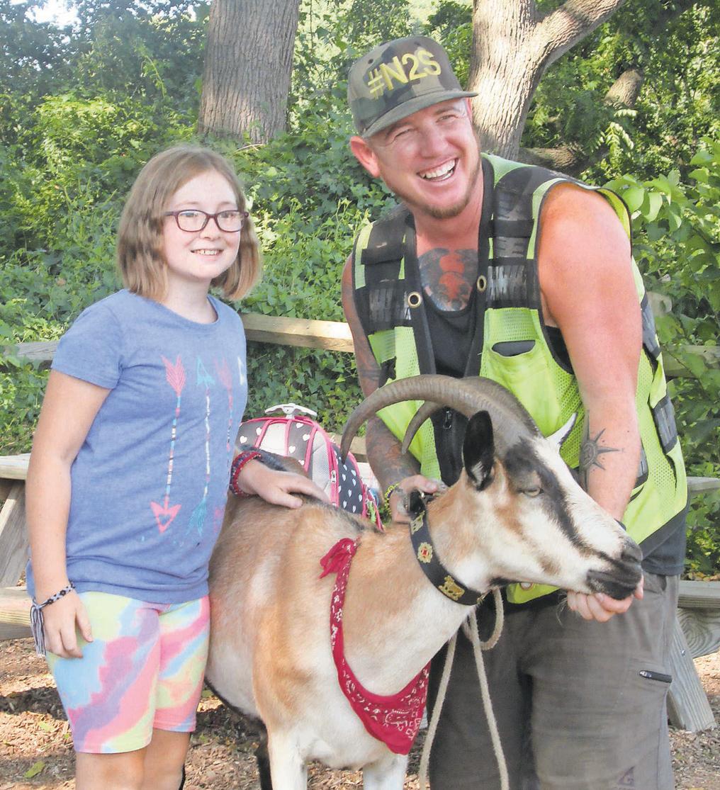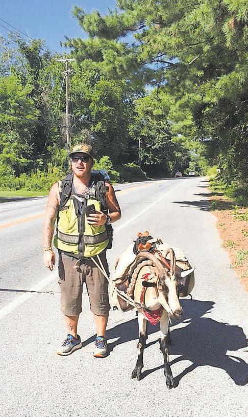 Steve Wescott and his goat, Miles, pass through the county on their way to Times Square has taken a leisurely route since he started the first leg in May of 2012. If people want to host him overnight, that’s fine. If they want him to come and speak to a group, that’s fine, too. Last Tuesday was one of those days, and as Wescott and Miles walked up to a picnic table behind the charter school, his audience of 11 children was impressed.