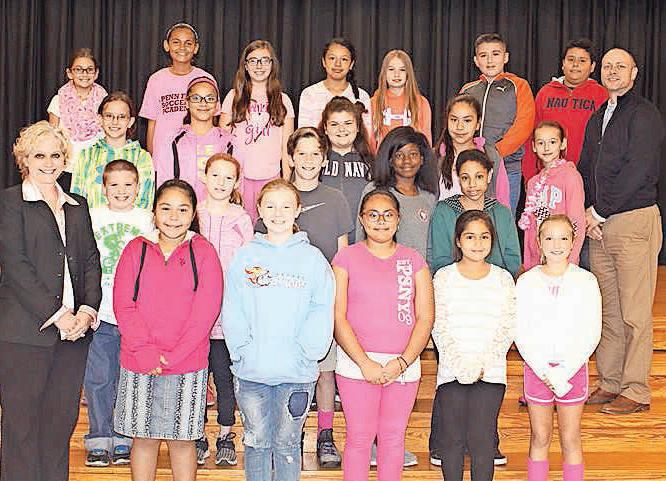 from left are Hopewell Elementary School Earlyact Club 2016 inductees Jake Ross, president; Madeline Soule, vice-president; Brianna Santos, treasurer; Ella Koechert, secretary and Sophia Lentz, historian; 2015 inductee Elizabeth Evans-Ralston, Parliamentarian; and Oxford Rotary Club President Tracie Eller. Second row from left are 2016 sixth grade inductees Brooke Brower, Bailey Charlton, Riley Fitzgerald, Guadalupe Juarez, Makenzie Lane, Aiden Merges, Ben Parry, Kara Phelan, Briana Pollock and Emma Zaleski. Top row from left are Assistant Principal Jason Soule, Oxford Rotary Earlyact liaison Dr. Raymond Fischer, 2016 fifth grade inductees Julia Carey, Avani Doshi, Sophia Schaefer, Tara Todd and Diana Valdes; Principal Dr. Nicole Addis and Earlyact advisor Dr. Pamela Brown. Not pictured are fifth grade inductees Amelia Donahue and Erik Tellez; and sixth grade inductees Brandee Levinsky and Giselle Sanchez-Alba.