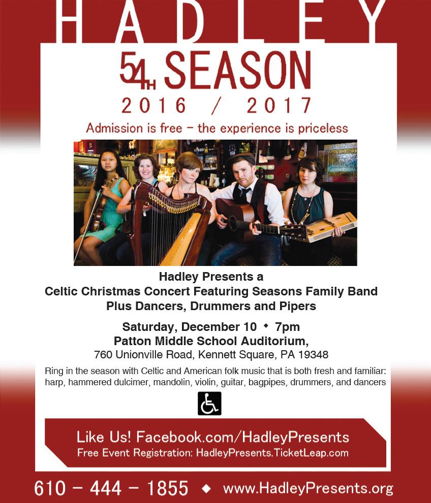 The auditorium is at 760 Unionville Road, Kennett Square. For more information, call 610444-1855 or visit www. HadleyPresents.org.