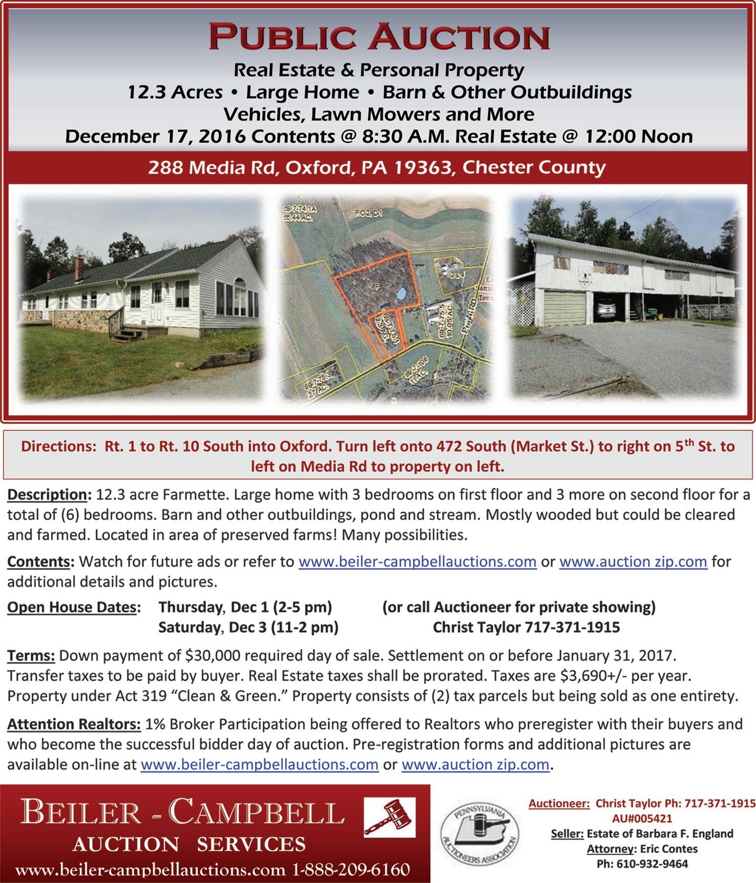 Public notice of auction of abandoned manufactured home located at 24 Londonderry Court, Cochranville, Chester County, PA, Notice is hereby given that R Samuel McMichael, Esquire on behalf of Robert Hodge will conduct a public sale of a manufactured home. Last known residents of this manufactured home (Skyline 1989) were Brian Rogers and Joyce Rogers, VIN #3110876Y, Tax parcel #4604_000010T. Honorable Nancy A. Gill, District Magistrate entered a determination of abandonment in favor of Robert Hodge against Brian D. Rogers and Joyce F. Rogers. Subsequently, Robert Hodge obtained an order for possession of the property at the address described above and possession of the property was granted to Robert Hodge by order of the above described court. A public auction is scheduled for Monday, December 5, 2016 at 11:00 am and the above described manufactured home will be sold to the highest bidder. The buyer of this home shall be responsible for obtaining the appropriate transfer of registration of title according to MV form 16A. All proceeds will be distributed according to the required outline contained in the above mentioned Pennsylvania Manufactured Home Community Rights Act. Samuel McMichael 11p-30-1t