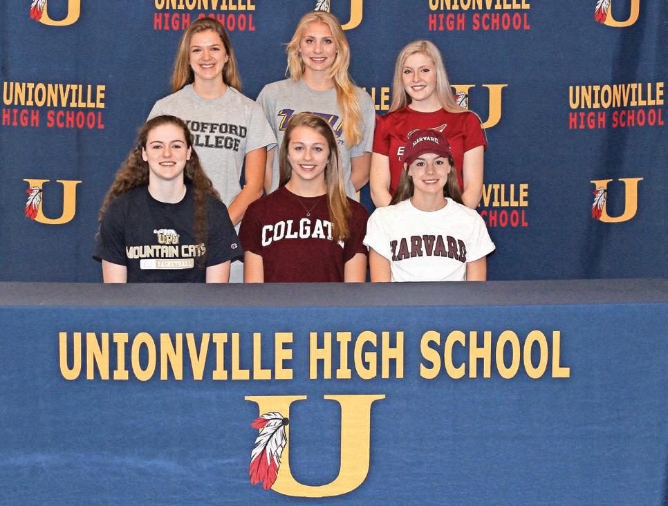 Several Unionville High School athletes recently announced their commitment to play their sport in college next season. Seated from left to right: Maddie Shanahan (basketball at the University of Pittsburgh at Johnstown); Allie Lowe (volleyball at Colgate); and Anna Juul (running at Harvard). Standing from left to right: Lauren Adams (lacrosse at Wofford); Elle White (soccer at West Chester University); and Mackenzie Myers (lacrosse at Erskine College).