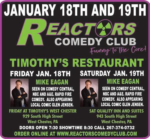 Reactors Comedy Club, in the Quality Inn and Suites (943 S. High St., West Chester). Hosts live comedy presented by Reactors on weekends. Doors open at 7:30 p.m., and showtime is 8:30 p.m. Admission is $20 at the door. Visit www. reactorscomedyclub.com. The schedule includes: Mike Eagan, Glen Jensen and Andy Lane (Jan. 18 and 19 at Timothy’s Lionville, 120 Eagleview Blvd., Exton); Jimmy Carroll and Todd Chappelle (Jan. 25 and 26 at the Quality Inn and Suites); Chris Rich, Tommy Highland and Brendan Donegan (Feb. 2 at Timothy’s Lionville, 120 Eagleview Blvd., Exton).