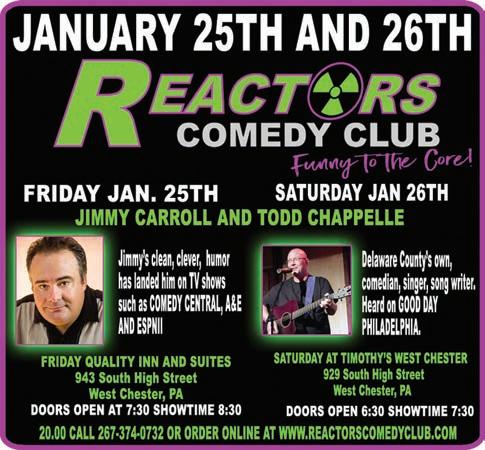 St., West Chester). Hosts live comedy presented by Reactors on weekends. Doors open at 7:30 p.m., and showtime is 8:30 p.m. Admission is $20 at the door. Visit www. reactorscomedyclub.com. The schedule includes: Jimmy Carroll and Todd Chappelle (Jan. 25 and 26 at the Quality Inn and Suites); Chris Rich, Tommy Highland and Brendan Donegan (Feb. 2 at Timothy’s Lionville, 120 Eagleview Blvd., Exton).