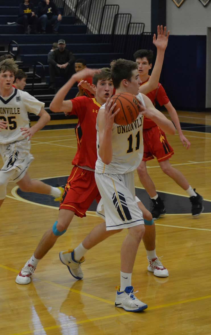 in the one-and-one, so Unionville inherited the ball on the sideline. On Unionville’s ensuing in-bounds play, the pass was deflected and the Indians were called for a foul, leading to a lastsecond shot attempt by Richardson that fell short at the buzzer. Carr led all scorers with 16 points, followed by 11-point efforts by teammates Richardson and Brenden Merten, who contributed a trio of three-pointers. Unionville was led by 14-point games by FureyBastian and Lenkaitis, while Hockenberry
