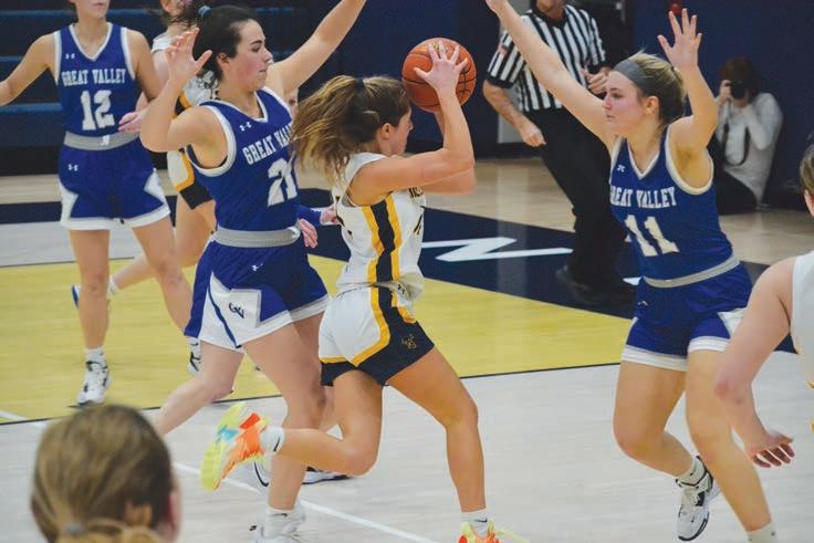 Unionville Girls Varsity basketball coach Fred Ellzy gathers with his team during a third quarter timeout that saw the Longhorns overcome a first-half deficit to beat Great Valley, 42-34 on Jan. 26. For a complete game summary and additional photos, see Page 4A.