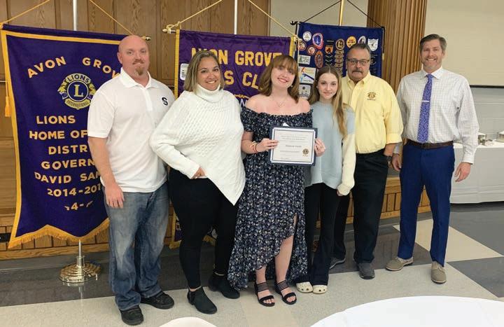 Grove Charter School. Hannah, who has committed to attend Stockton University in New Jersey, is pictured with her parents, Kevin Smith and Erin Smith, her sister, Shayna Smith, Avon Grove Lions President George Steele and Avon Grove Charter School Assistant Principal Mark Miller.