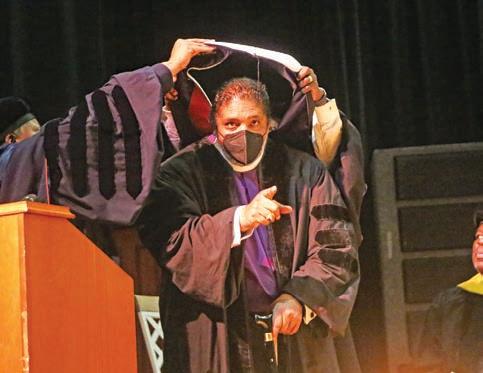 Following his presentation, university President Brenda Allen and Trustee Board Chairman Gerald Bruce awarded Barber his 13th honorary doctorate.