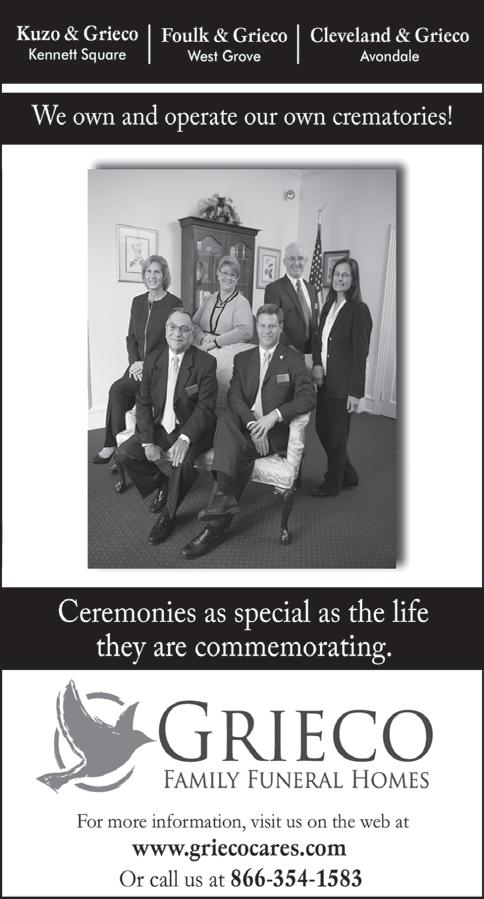 Survivors include her grandson, Kevin Buckingham (Sarah Young) of Chadds Ford. A visitation will be held from 10 to 11 a.m. March 16 at Kuzo & Grieco Funeral Home (250 W. State St., Kennett Square). Her funeral service will follow at 11 a.m. Interment will be in Longwood Cemetery. Contributions in her memory may be made to the Alzheimer’s Association, 399 Market St., Suite 102, Philadelphia, PA 19106. To view her online tribute and to share a memory with her family, visit www.griecocares.com.