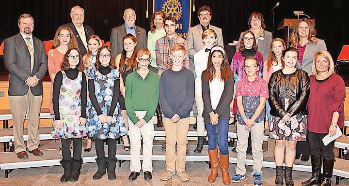 eighth grade inductees Megan Berg and Miranda Berg and seventh grade inductees Aiden Merges, Michael Stefanosky, vice-president; Brianna Santos, Jimmy Sapp and Nikki Shelderfer; and chapter advisor Jennifer Bartnik. Middle from left are eighth grader Rachel Sedlak, seventh grade inductee Ava Corcoran, eighth grade inductees Gina Martinelli, president; and Luke Russell, seventh grade inductee Elizabeth Evans-Ralston, secretary; eighth grade inductee Marissa Berg, treasurer; and seventh grade inductee Makenzie Lane, public relations. Top from left are Oxford Area School District Superintendent David Woods; Robert Listerman, Rotary District 7450/Area 9 Assistant Governor; David Haradon, past Area 9 Governor; Christine Grove, Oxford Area Chamber of Commerce Executive Director; Dr. Raymond Fischer, Oxford Rotary Club Interact liaison; Dawn deFuria, Rotary District 7450/ Area 9 Governor and Principal Tami Motes. Seventh grade inductee Haley McCoy, public relations; and eighth grade inductee Charlotte Weir are not pictured.