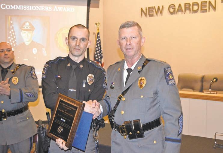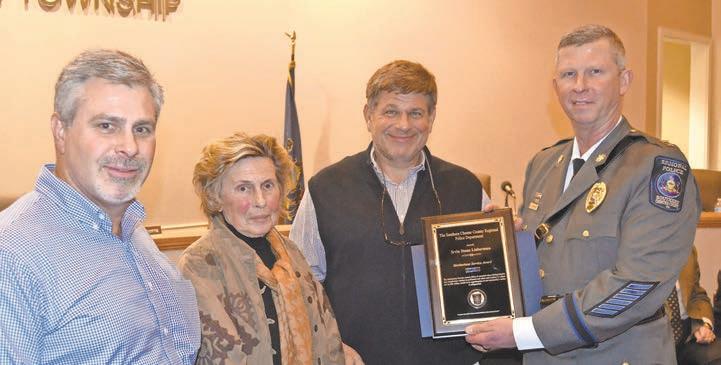 Former long-time Chester County Press editor and columnist Irvin Lieberman was the recipient of the Meritorious Service Award, given to him posthumously by the Southern Chester County Regional Police Department on March 14. Accepting the award for Mr. Lieberman from Chief of Police Gerald Simpson was his wife Judy, and sons Andy