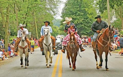 Clydesdales hitched to the Budweiser wagon riding through the borough.