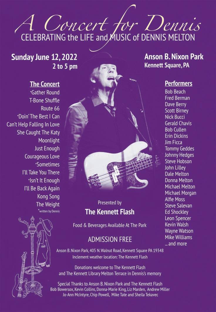 “A Concert for Dennis” will be held on June 12 from 2 p.m. to 5 p.m. at the performance stage at Anson B. Nixon Park in Kennett Square. In the event of inclement weather, the concert will be held at The Kennett Flash. Food and beverages will be available at the concert. Admission is free, and donations will be welcome to benefit The Kennett Flash and the Melton Terrace at the new Kennett Library & Resource Center.