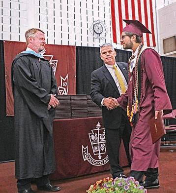 Valedictorian Emiliano Zetune greets Superintendent David Woods, left, and shakes hands with School Board President Joseph Tighe as he receives his diploma.
