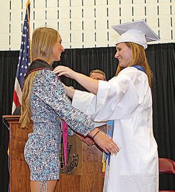 All photos by Chris Barber Senior Class President Kenna Mullins, right, passes the presidential sash to Junior Class President Paige Pechin.