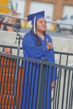 Kelly Salmeron-Alvarez leads the stands with reverence during the singing of the “Star-Spangled Banner.”