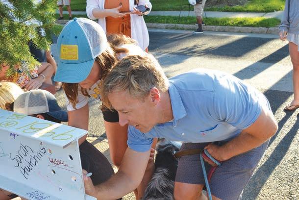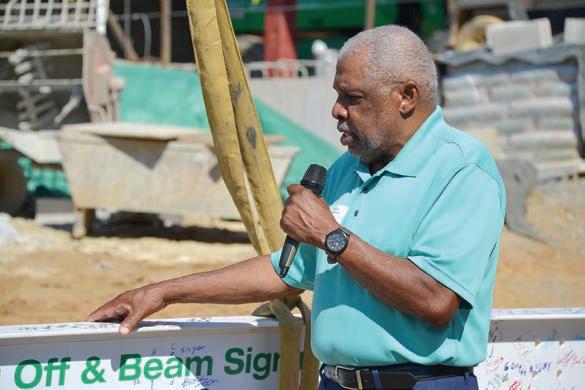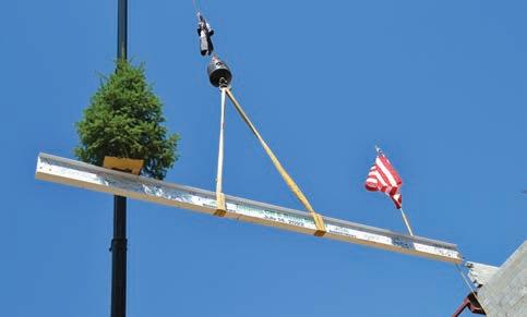 “topping off” ceremony, however, was the large steel beam, painted white and dotted with the multicolored signatures of community members. At about 10 a.m., the beam was pulled into the blue sky by a crane and eventually locked into place into the deep red girder labyrinth of what will become a source of learning, ingenuity and curiosity for the residents of eight