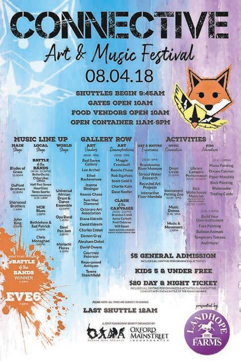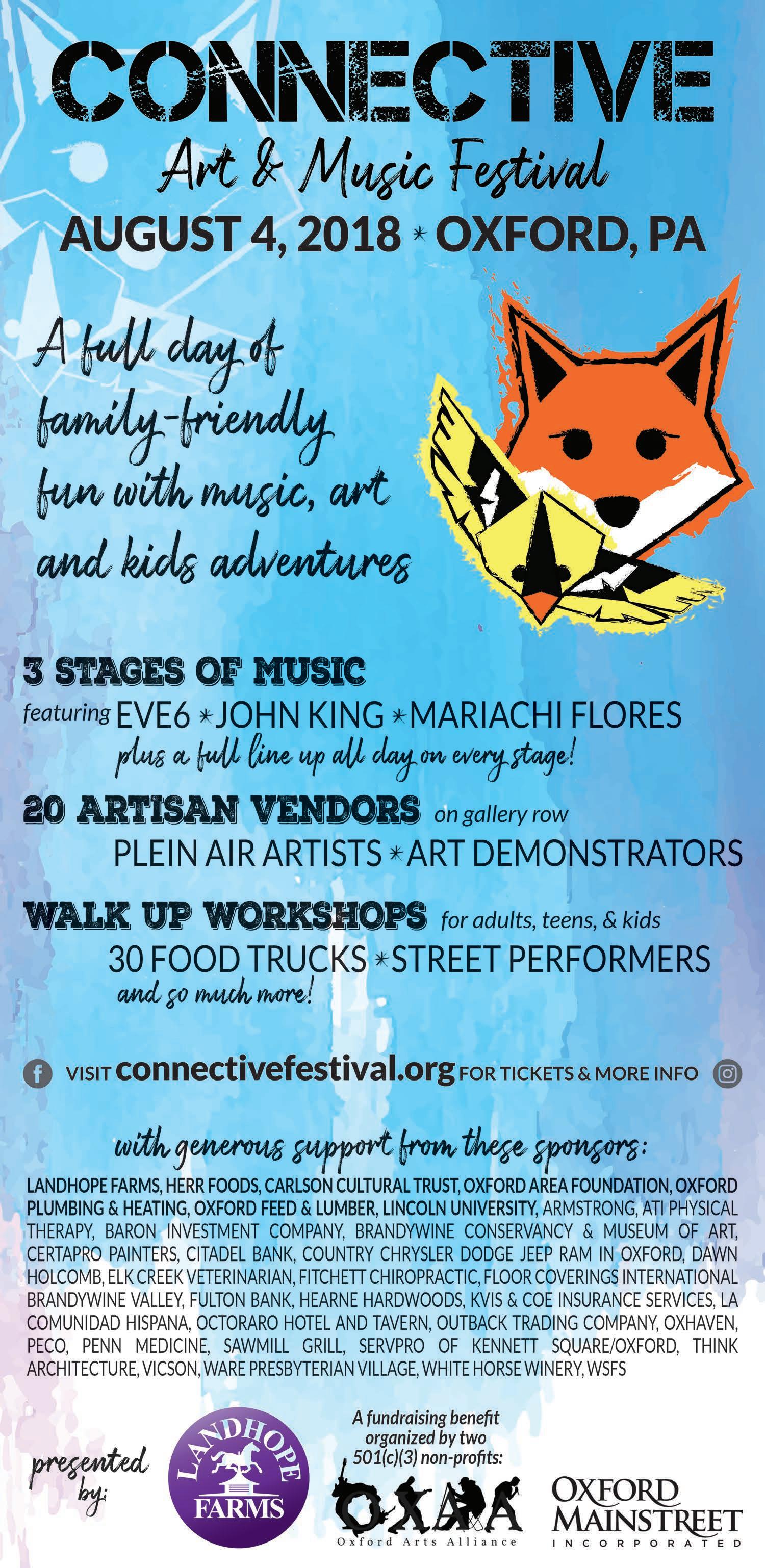 Landhope Farms is the main sponsor of the Connective Art & Music Festival. Oxford Feed & Lumber presents the lineup of country music throughout the day, including headliner John King, the Sherwood Brothers, The DuPont Brothers, Blades of Grass and Chris Mongahan. The Local Stage will have Moe Blues and Bethlehem and Sad Patrick, among others. Lincoln University presents the sights and the sounds of the world’s cultures on the World Music stage, which will include everything from a 15-person African drum group to a mariachi band.