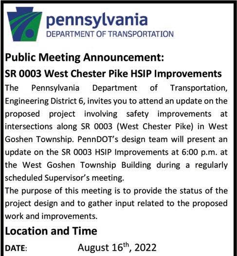 NOTICE is hereby given that the Zoning Hearing Board of Pennsbury Township will hold a Public Hearing at the Pennsbury Township Building, 702 Baltimore Pike, Chadds Ford, Pennsylvania, on Monday, August 22, 2022, at 7:00 p.m. at which time the Board will hear the following matter: In re: Application of Michael Attanasio, seeking a variance from the requirements of zoning ordinance section 162-2002.A.2(b) and (c) so as to permit the installation of an above-ground swimming pool within the legal “front” yard of property located at 1391 Parkersville Road, Kennett Square, PA (UPI# 64-3-14.2) in the Township’s R-2 residential zoning district. If you are a person with a disability and wish to attend the public meeting scheduled above and require an auxiliary aide, service or other accommodation to participate in the proceedings, please contact Kathy Howley at 610-388-7323 to discuss how Pennsbury Township may best accommodate your needs. Edward M. Foley, Solicitor Brutscher, Foley, Milliner, Land & Kelly, LLP, 213 East State Street, Kennett Square, PA 19348 8p-3-2t