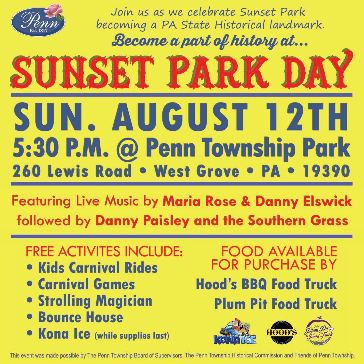 Following the dedication, Sunset Park Day will be held at the Penn Township Park (260 Lewis Rd., West Grove) from 5:30 to 8 p.m. There will be live performances by Maria Rose and Denny Elswick, followed by Danny Paisley and the Southern Grass. The event will also include a strolling magician, carnival games, a kid’s carousel and ferris wheel, food trucks and more.