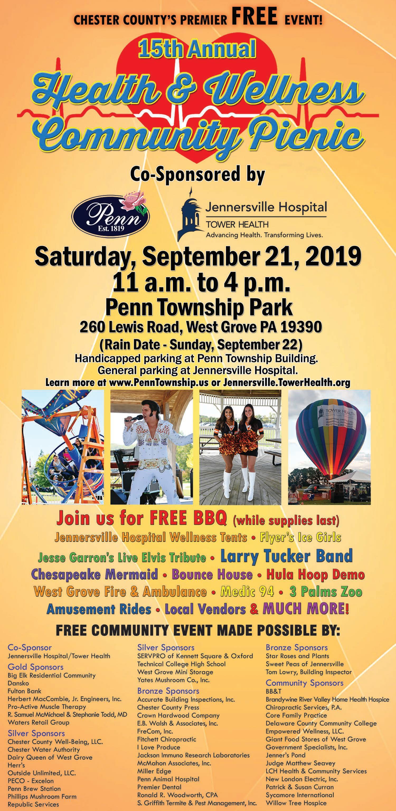 Penn Township Park will be the site of the 15th annual Health and Wellness Community Picnic on Sept. 21 from 11 a.m. to 4 p.m. (rain date Sept. 22). The free event features free food, children’s activities and games, health screening information and more.
