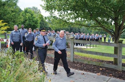 that found escaped convict Danelo Cavalcante on Sept. 13 after a two-week search – leads members of the State Police out of Unionville Community Park after receiving praise from Pennsylvania Gov. Josh Shapiro.