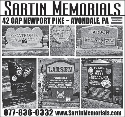 The Chester County Press publishes obituaries free of charge for funeral homes with active advertising accounts only. Others with a connection to southern Chester County are charged a modest fee. Obituaries appear on the Wednesday after they are received with a Monday 5pm deadline. They are also posted on www. chestercounty.com. Photos should be sent as .jpeg attachments to the obituary text. To submit an obituary to the Chester County Press or for a rate quote, email the information to editor@chestercounty.com.