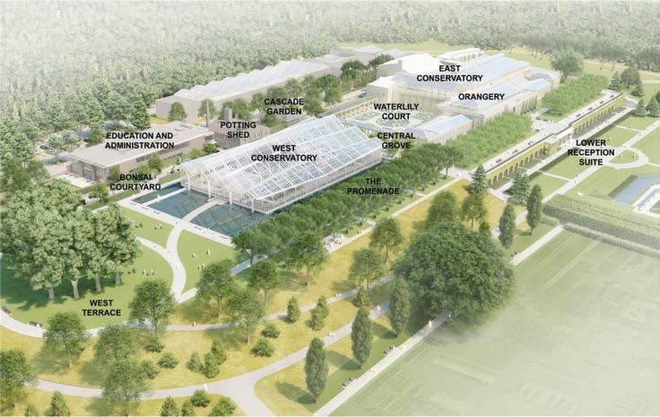 The 32,000-square-foot West Conservatory will be set off by its asymmetrical peaks and islands of interior Mediterranean-inspired gardens.
