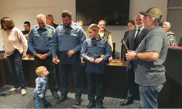 Harris commended two police officers, officer Scott Richards, who was sworn in in 2006, and officer Karlianna Eller, who was sworn in in 2021, after they responded to the fire and were instrumental in helping