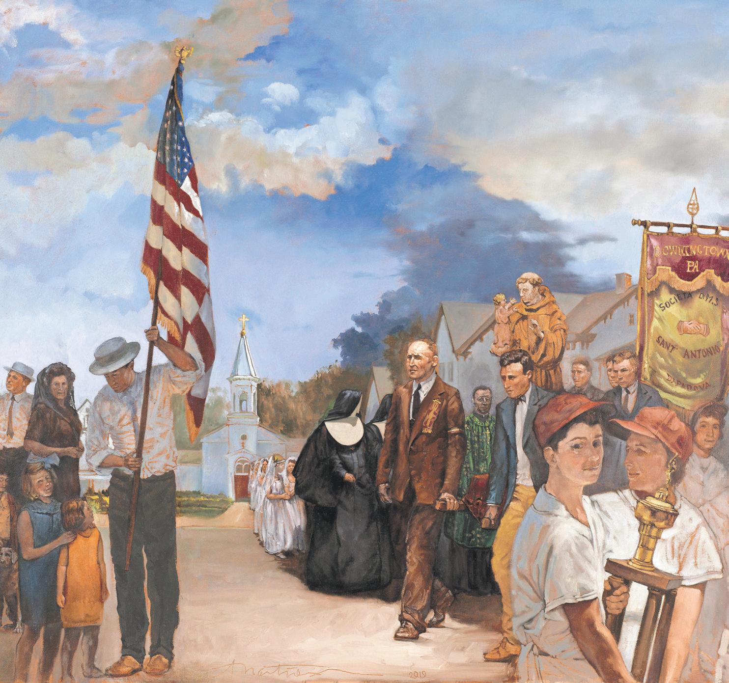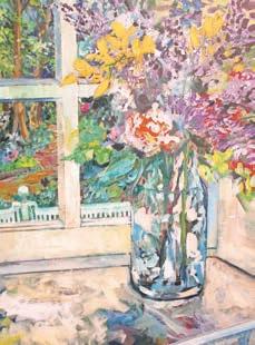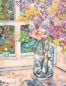 oils quietly whisper. Mangano’s “Howard Pyle Studio” is a vivid floral in which the colors outside the window are nearly as eye-popping as the blooms indoors. Flowers boldly take center stage elsewhere as well, as in “Sunflower Conversations” and “Afternoon Setting on Brandywine,” “Flowers and Blue Pitcher” and “Daisies and Delphiniums.”