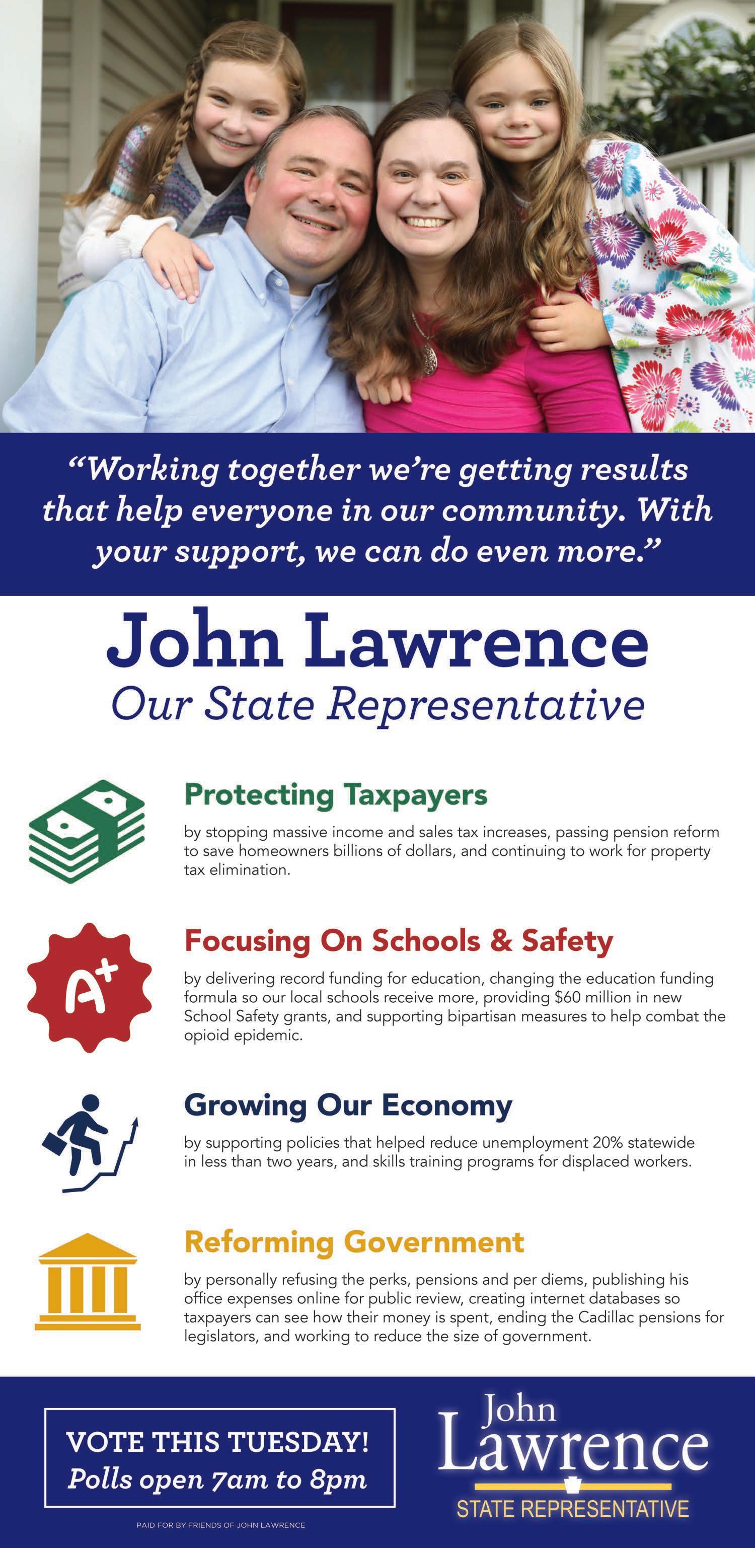 Ever since he was elected to the State House in 2010, Lawrence has been a champion for government reform, an advocate for fiscal responsibility, and a proponent for smaller government. His values and views don’t change because another Election Day is approaching. He points to his record as a consistent voice on issues like government reform and fiscal accountability, and to his work serving the constituents in the 13th District as reasons why he wants to return to the State House in 2019.