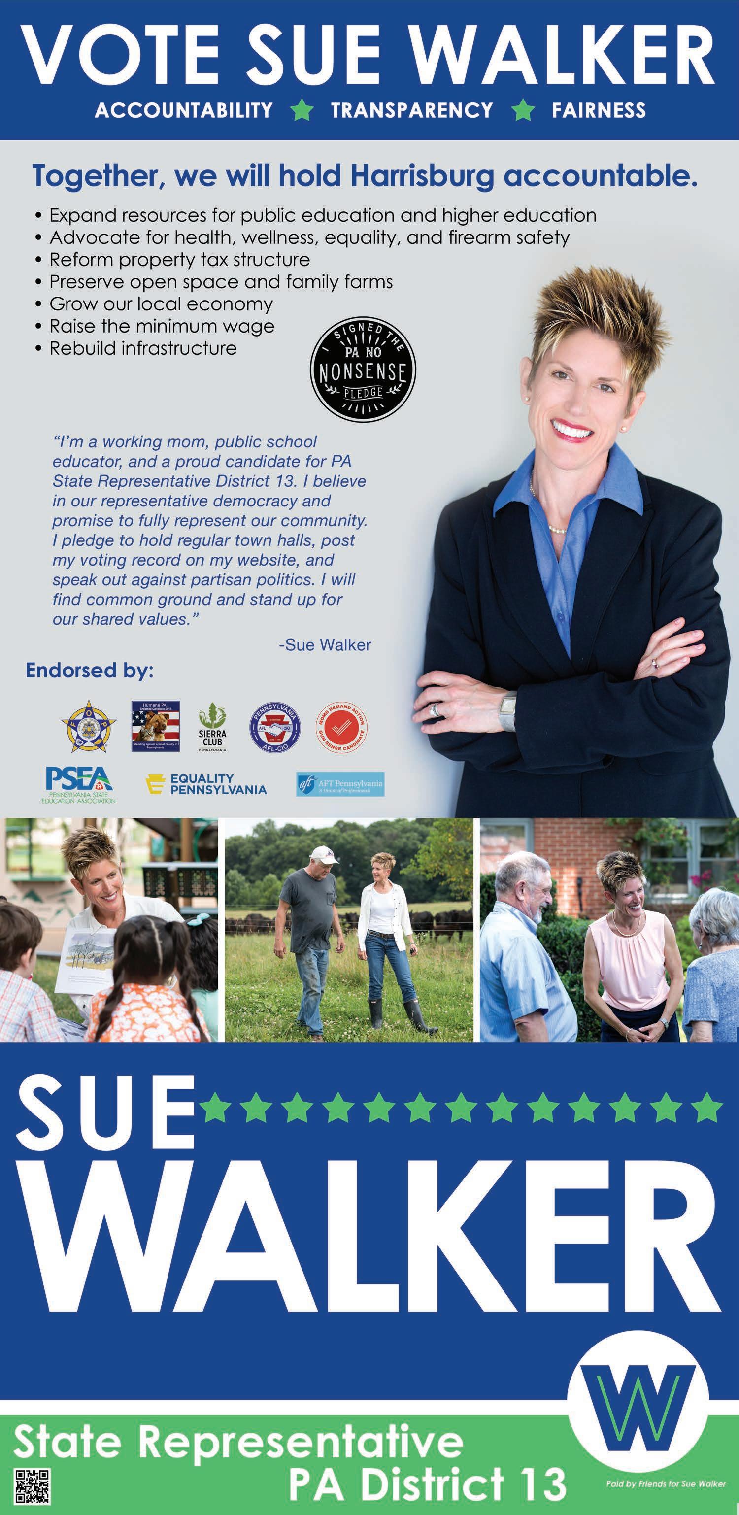 Sue Walker, the Democratic candidate for State Representative in District 13, has lived with her husband, Mike, and their two sons, Zach and Ryan, in Franklin Township for the past 20 years, and by all accounts, her life and the life of her family is firmly entrenched in the economic, educational and social fabric of Chester County.