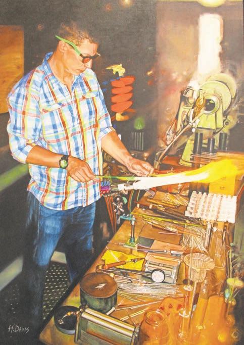 Jackson, at his easel, is surrounded by the toys and trinkets featured in his paintings, but the stuffed monkey hanging from his canvas is the perfect touch of whimsy, and very much in keeping with Jackson’s sense of humor. In her portrait of Justin Smith, a glass artist, the workbench is full of glass objects, and Davis paints each one vividly. It’s a task she could have simplified by simply not having so much going on in the foreground, but she set the bar high and succeeds admirably.