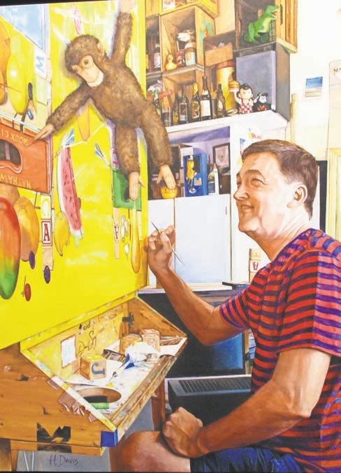 A large part of the show is “Admiration of Souls,” a series of large portraits of other Chester County artists. Anyone who has met them – Lele Galer, Adrian Martinez, Jeff Schaller and Robert Jackson among them – will recognize the likenesses immediately, but Davis goes further by putting her subjects in surroundings that embellish them.