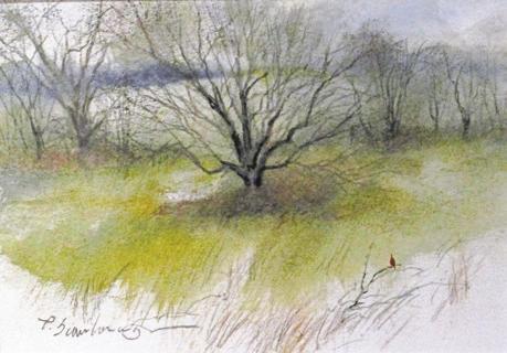There are several originals by the late artist Paul Scarborough, including an atmospheric watercolor, “Winter Mist,” and a glowing green view of the Brandywine titled “Lazy Day Morning.”