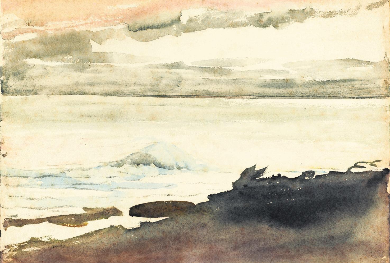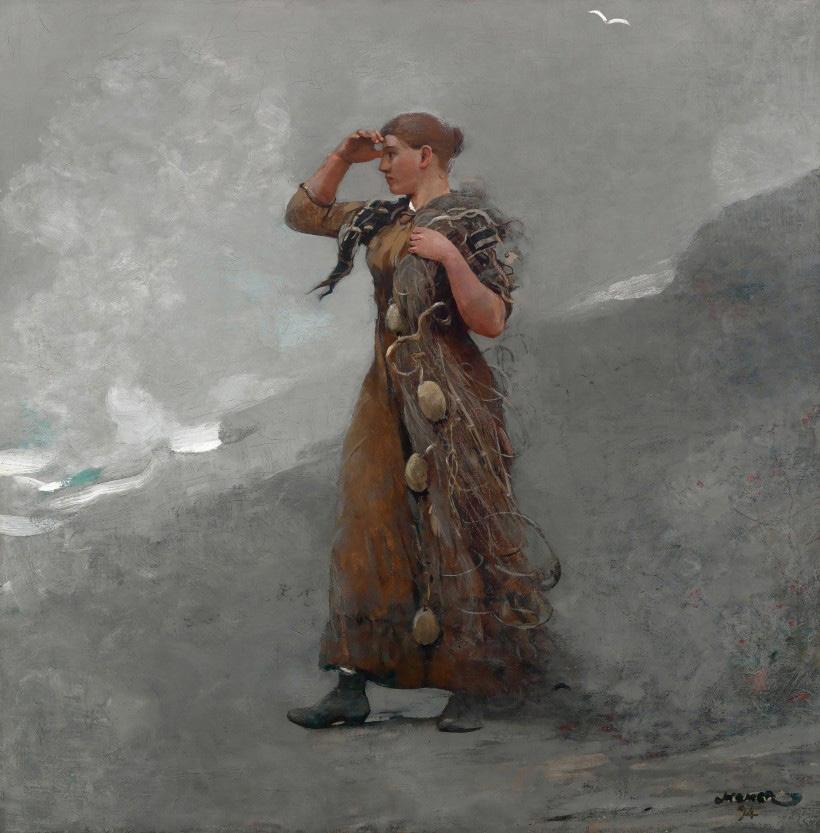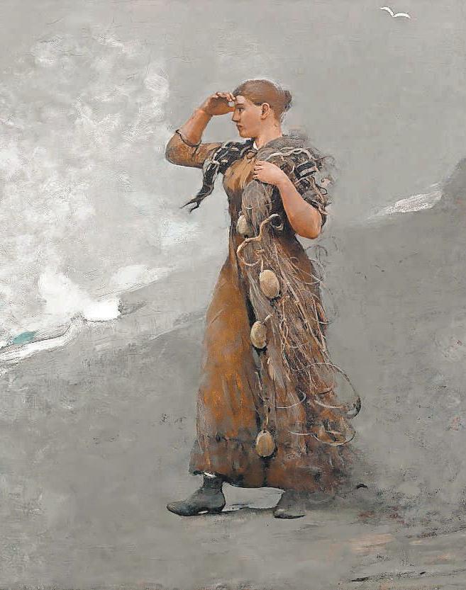 everyone has come to see. His developing skills as an artist are clear in paintings such as “Sandy Beach With Breakers,” a simple depiction of white surf and clouds, and a wide swath of unoccupied sand. In “Evening on the Beach,” he shows two women in voluminous skirts trying to maintain their modesty in a high wind. But a hallmark of most of Homer’s work is quiet observation. His figures don’t take center stage or announce themselves as the focus of the painting.