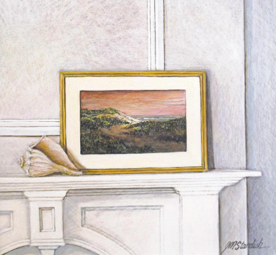 Standouts include J.M. Standish’s “Still Life Or Landscape?”, an egg tempera of a painting on a mantlepiece that’s two