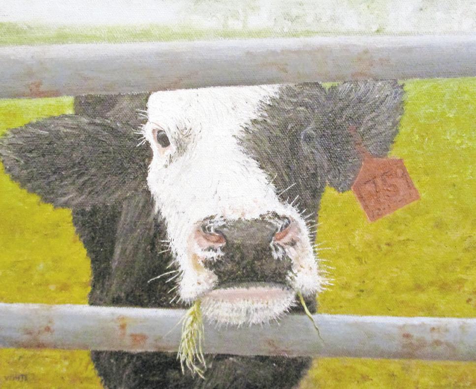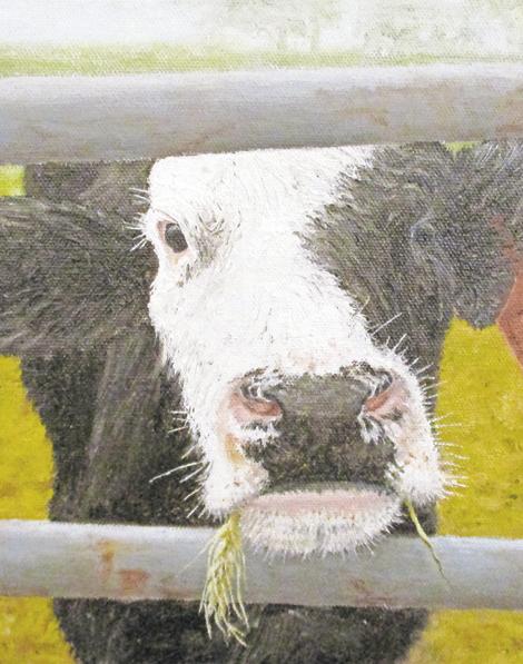 Timothy Wadsworth’s “The Clearing” is a very nice watercolor of a field, woodland and a moody sky. “Hayseed,” by Steven White, captures a curious cow with an adorably bristly face.