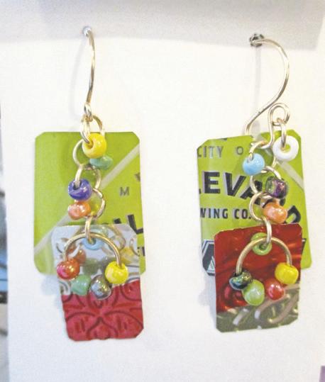 And take a moment to examine the upcycled earrings by Dona Antonelli. She makes use of plastic gift cards and other items that would otherwise end up in landfills, cutting and shaping them into earrings and other jewelry.