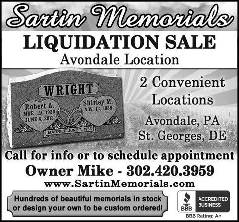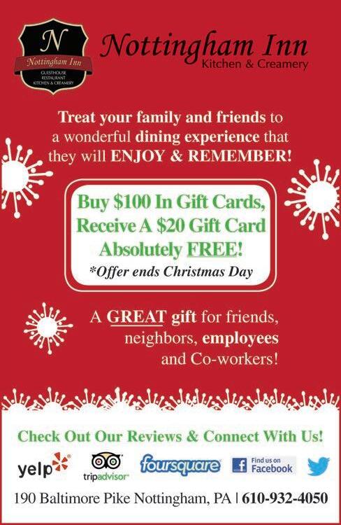 4 p.m. and 6 p.m. Tickets are $20 ($15 for CFHS Members), and must be purchased in advance at the Society’s website, www. chaddsfordhistory.org, by phone at 610-388-7376 or in person at the Society’s office. Space is limited, and these tours will sell out. The Society’s office is open Monday through Friday from 9:30 a.m. to 4:30 p.m., and is located at 1736 N. Creek Rd. in Chadds Ford. Visit www. chaddsfordhistory.org for additional information and tickets.