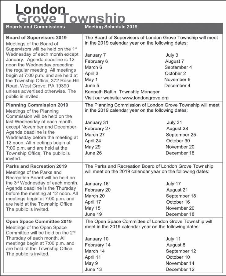The reorganization meeting of the Penn Township Supervisors will be held on Monday, January 7, 2019 at 6:00 p.m. at the Penn Township Municipal Building, Finnen Community Room, 260 Lewis Road, West Grove, PA. The regular Board of Supervisors meeting will be held immediately following the reorganizational meeting. The reorganization meeting of the Penn Township Planning Commission will be held on Tuesday, January 8, 2019 at 7 p.m. at the Penn Township Building, Finnen Community Room, 260 Lewis Road, West Grove, PA. The regular January Planning Commission meeting will be held immediately following the reorganizational meeting. Caitlin A. Ianni, Township Secretary 12p-12-1t