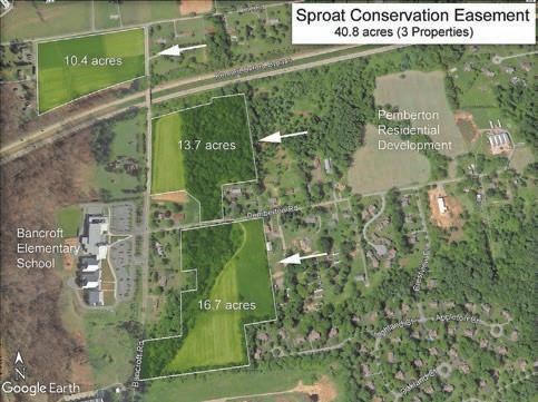 details behind their recommendation to acquire 43.1 acres of the Sproat Farm property, in the vicinity of the Bancroft Elementary School, along Bancroft Road, Pemberton Road and Line Road. Of those acres, 40.8 are expected to be placed in conservation easement and divided into three parcels: 16.7 acres, 13.7 acres and 10.4 acres, respectively. Of that acreage, 16.4 is designated as Highest Protection Area, and the remaining 24.4