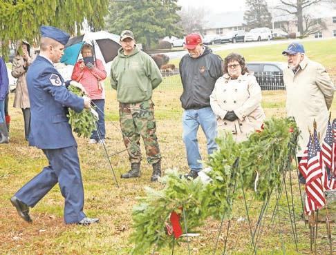 Ordinarily the wreath ceremony, now in its 11th year in Oxford, takes about a half hour and involves a benediction and patriotic testimonials. But in view of the disagreeable weather, master of ceremonies Larry Borst shortened the event somewhat.