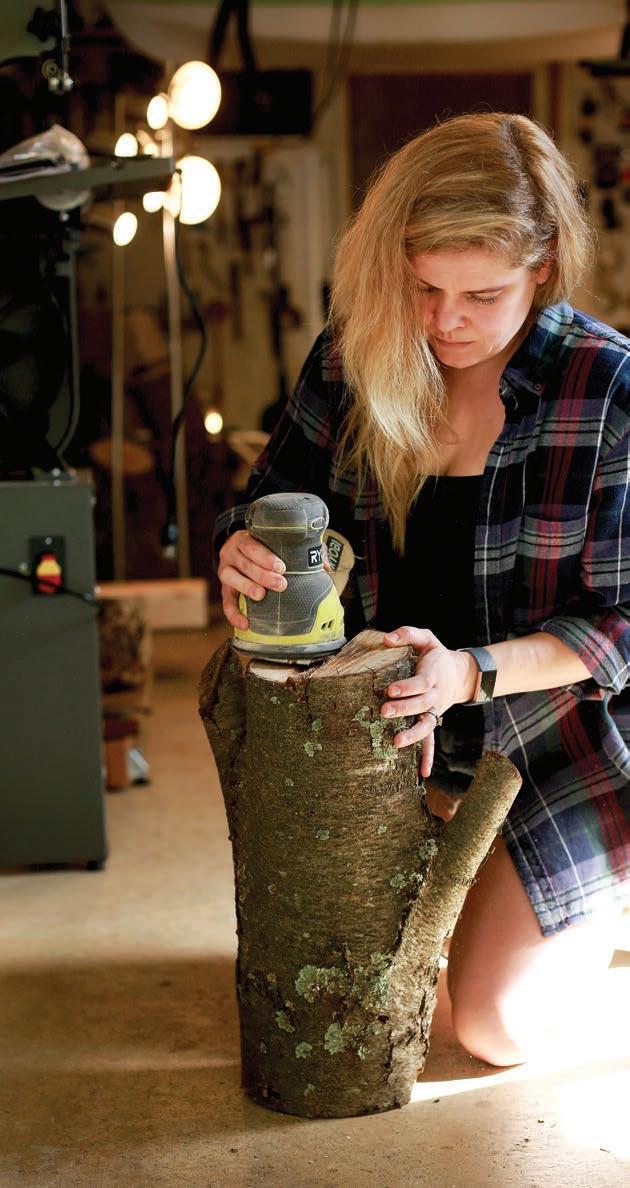 For the past several years, Bailey’s Indwell Designs has been turning both fallen trees and discarded salvage materials into sustainable furniture that fits not only her own home but also the homes of her clients. A quick look around her studio reveals the artist, her tools and piles of reclaimed wood planks, beams and discarded items that will be fashioned into bookshelves, sliding doors, dining room and coffee tables, mirrors, plant stands, benches and candle holders.