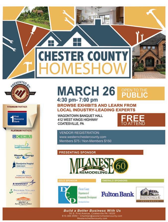 The Western Chester County Chamber works to recruit, retain and grow our region’s businesses and nonprofit organizations. We are proud to offer a multitude of ways to connect our members and residents through our events -- educational programs to strengthen business skills, after-hours mixers, young professionals events, and our Municipal Update Luncheon, just to name a few. We support area-wide organizations that help our community grow. Read more about these partners in our “In Each Issue” section of this publication.