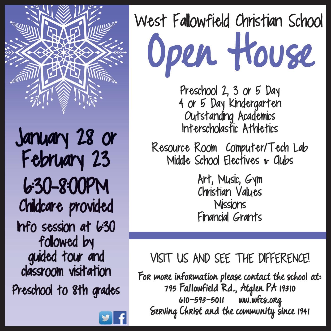 West Fallowfield Christian School has scheduled open houses for Thursday, Jan. 28 and Tuesday, Feb. 23 from 6:30 to 8 p.m. The evening begins with an information session at 6:30 p.m. followed by guided tours, meet the teachers and an overview of curriculum. Childcare is provided.